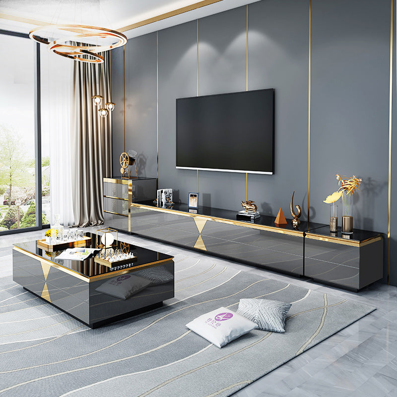 Black Glass TV Cabinet Glam Style Home Closed TV Stand Console