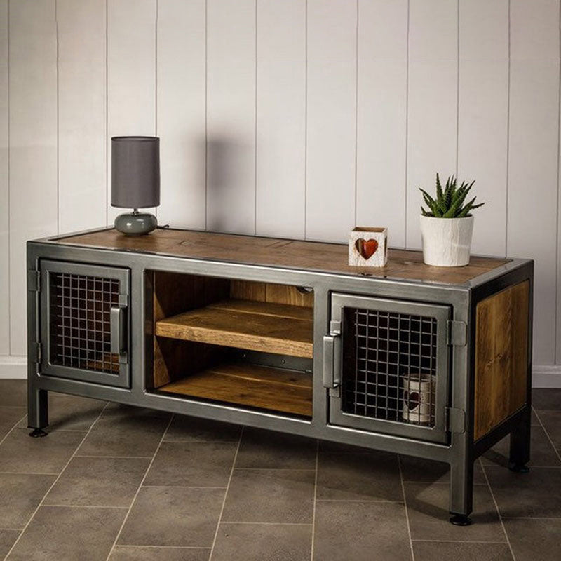 Brown Pine Wood Top TV Media Stand Industrial Media Console with Open Storage