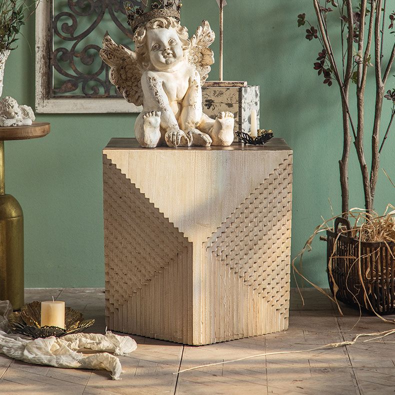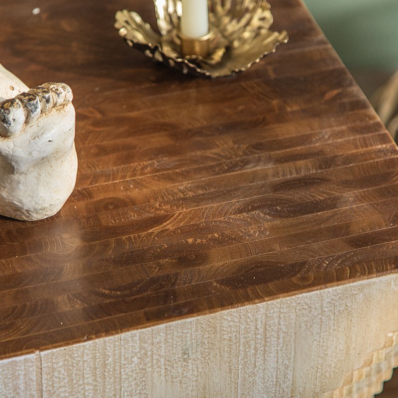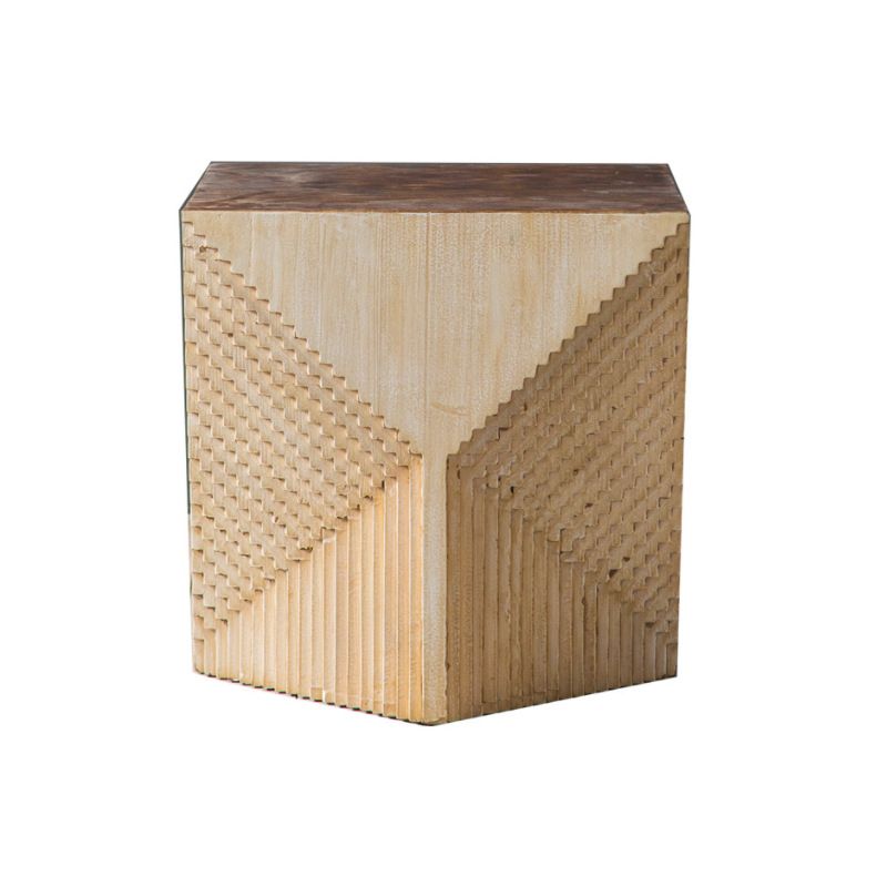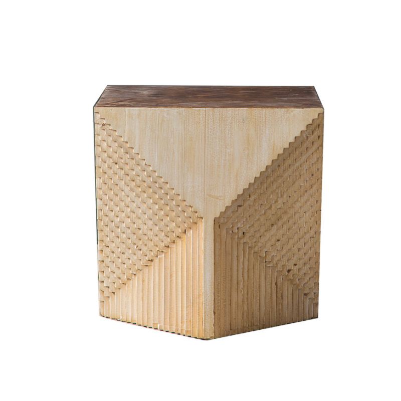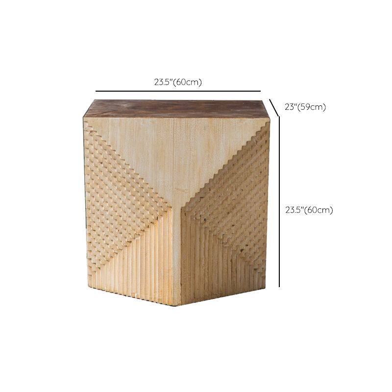 Solid Wood Drum End Table Rustic Engraved Design Accent Side Table