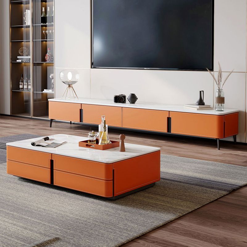 16.5" Bright Orange Leather TV Stand Console with 4 Storage , Nordic Stone TV Stand