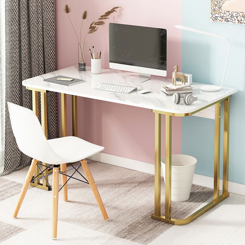 Glam Stone Rectangle Writing Desk 28.35" Tall White Office Desk with Gold Legs