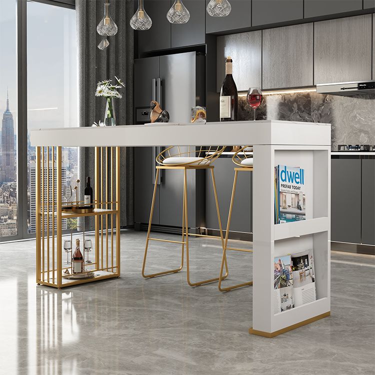 Rectangle Gold Marble and Wood Bar Living Room Pub Table with Double Pedestal