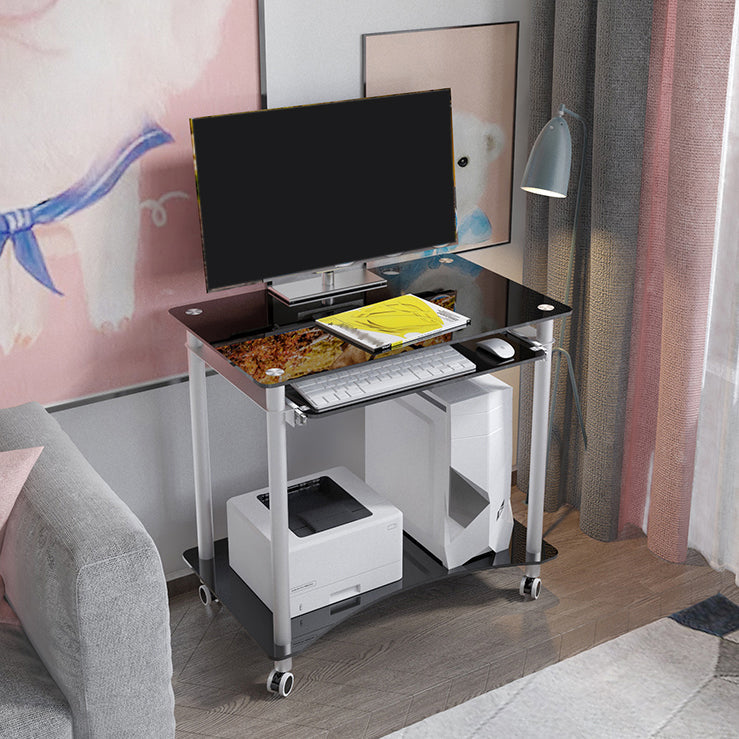 Rectangular Toughened Glass Computer Desk with Caster Wheels and Keyboard Tray