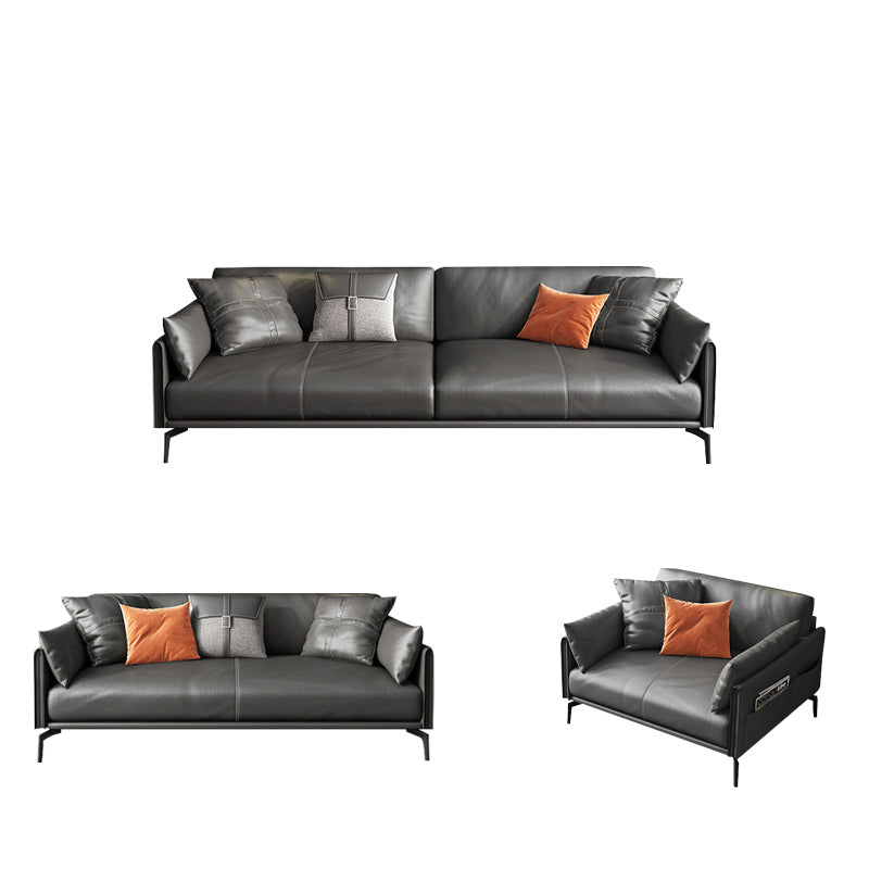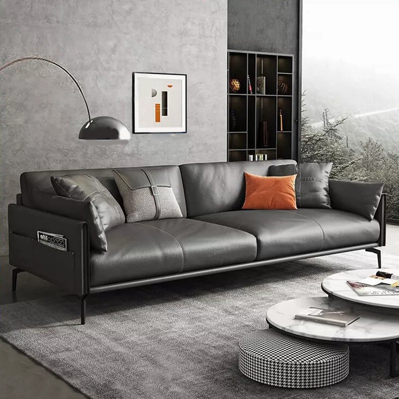 Mid-Century Modern Loose Back Sofa Gray Genuine Leather Aqure Arm Sofa