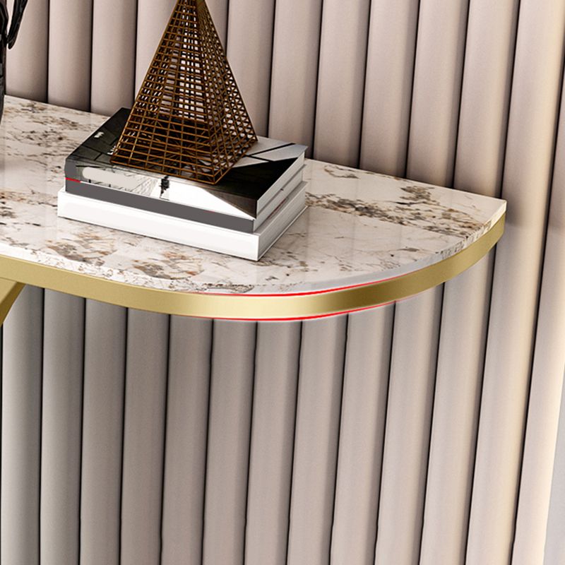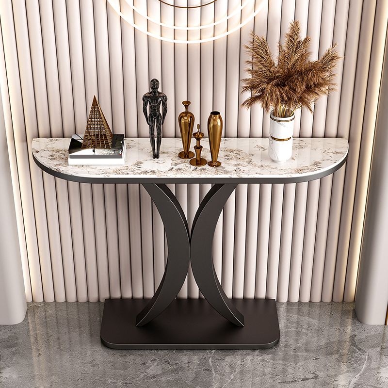 Mesa de acento de media luna glamorosa con tapa de piedra y base de pedestal de hierro