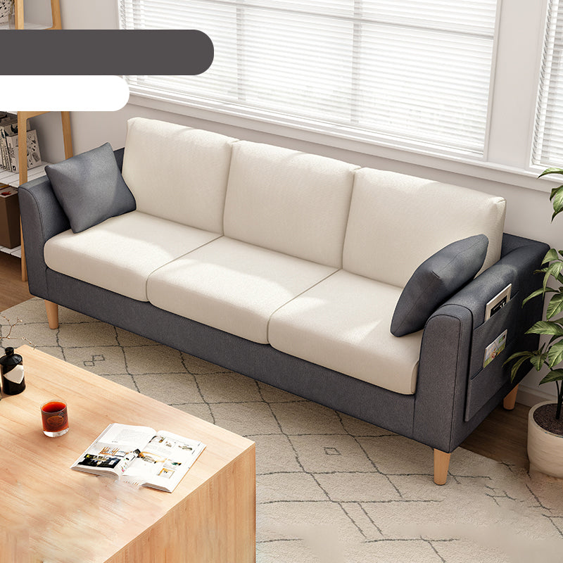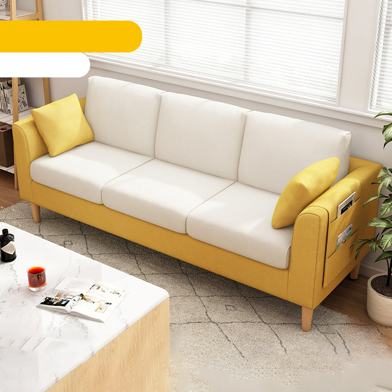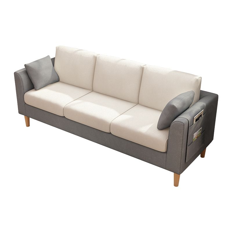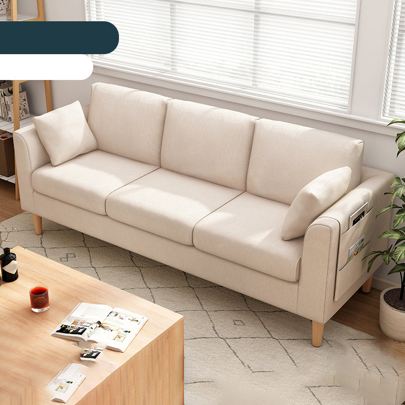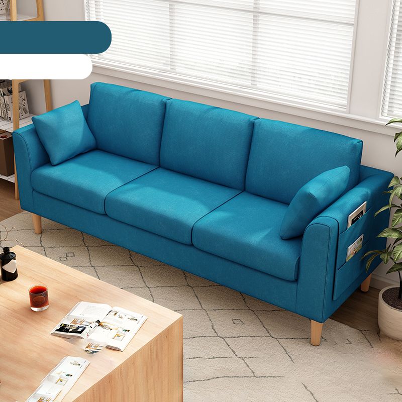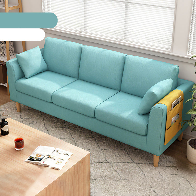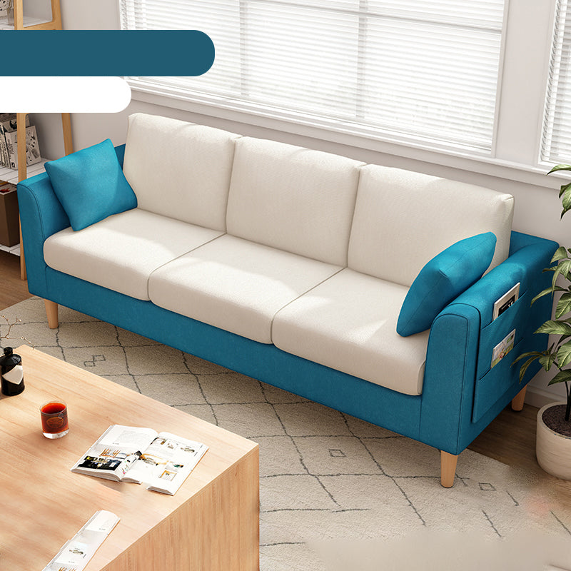 Canapé scandinave de 3 places avec oreillers en dos et bras de smoking et pattes en bois massif