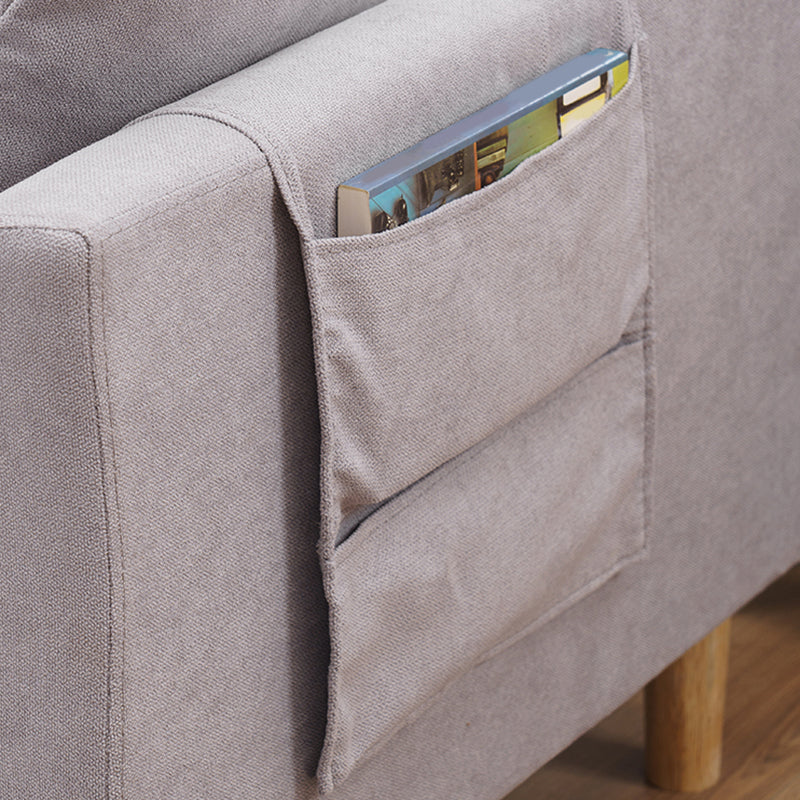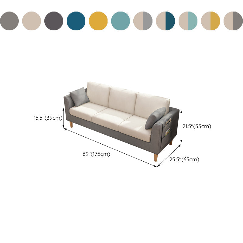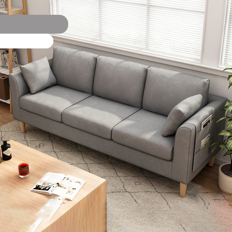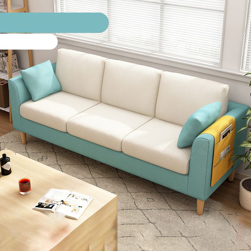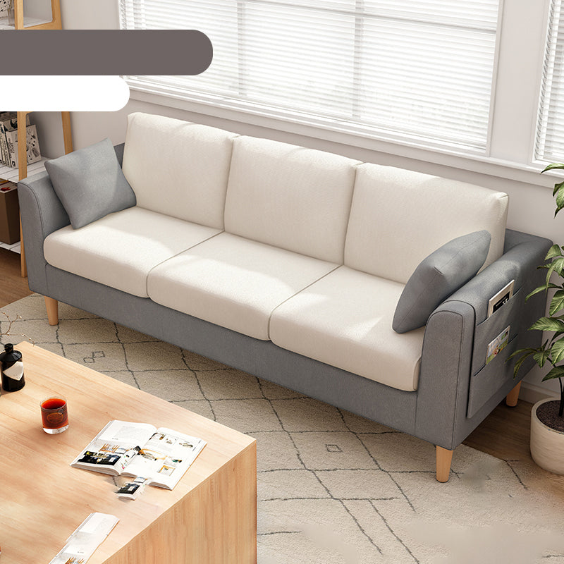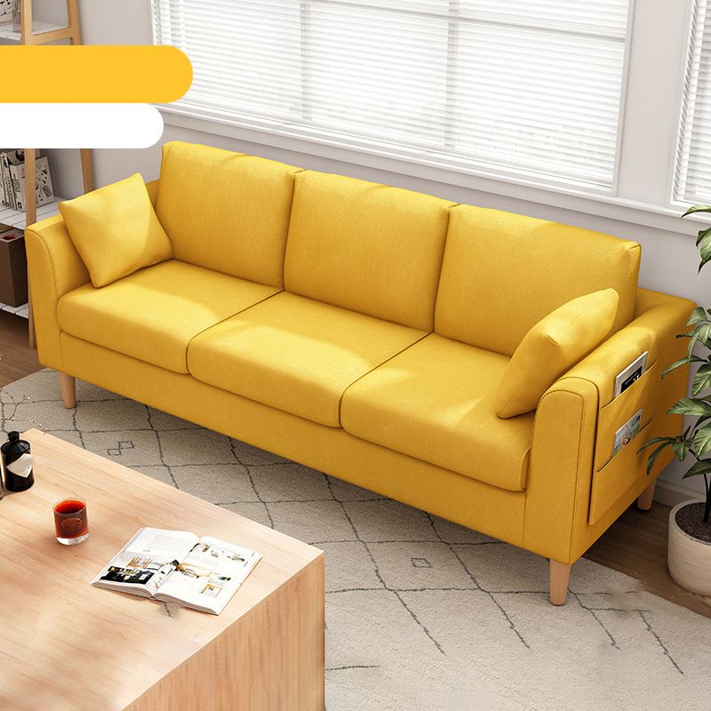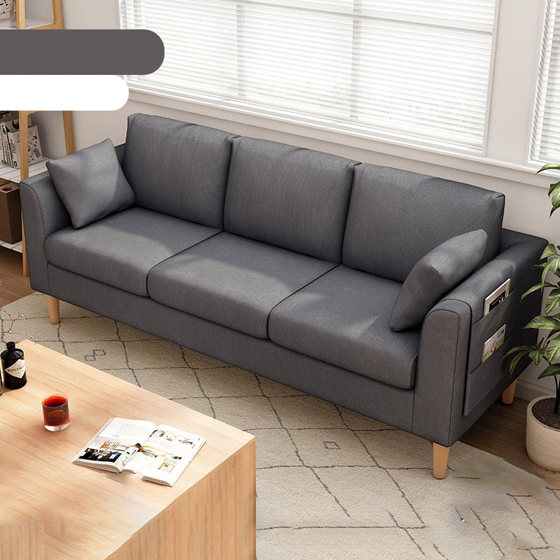 Canapé scandinave de 3 places avec oreillers en dos et bras de smoking et pattes en bois massif