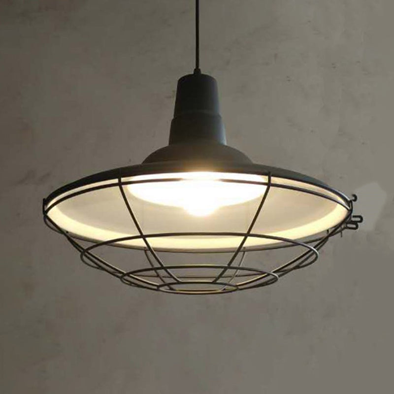 1 Head Iron Pendant Light Antique Black Pot Lid Shaped Restaurant Hanging Light Fixture with Cage Bottom Clearhalo 'Art Deco Pendants' 'Black' 'Cast Iron' 'Ceiling Lights' 'Ceramic' 'Crystal' 'Industrial Pendants' 'Industrial' 'Metal' 'Middle Century Pendants' 'Pendant Lights' 'Pendants' 'Rustic Pendants' 'Tiffany' Lighting' 2057507