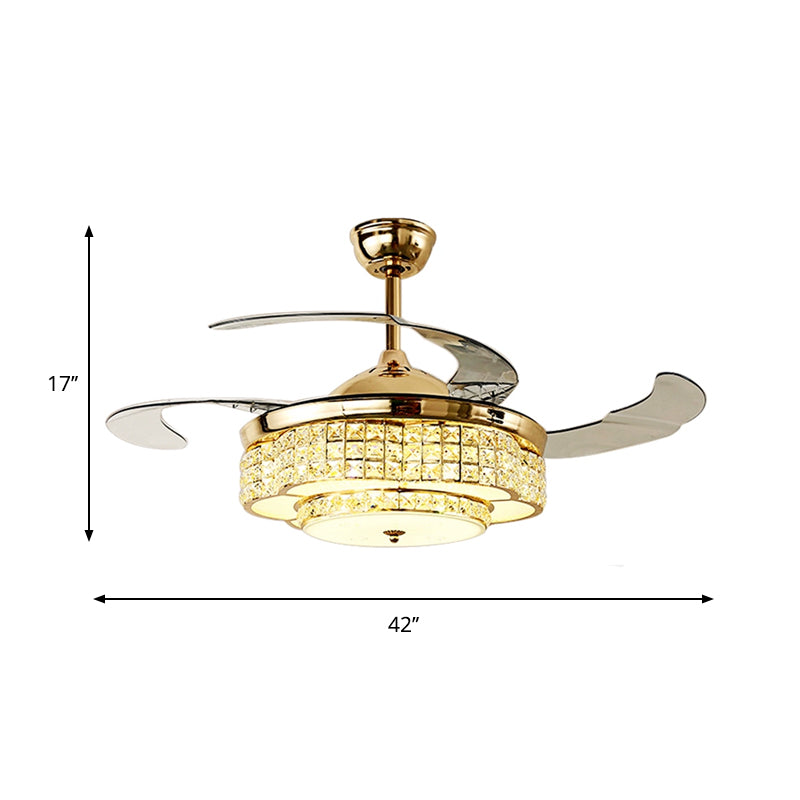 Ventilateur suspendu à LED de 42 po de W, moderne, circulaire, transparent, cristaux carrés, 3 pales, montage semi-encastré, doré