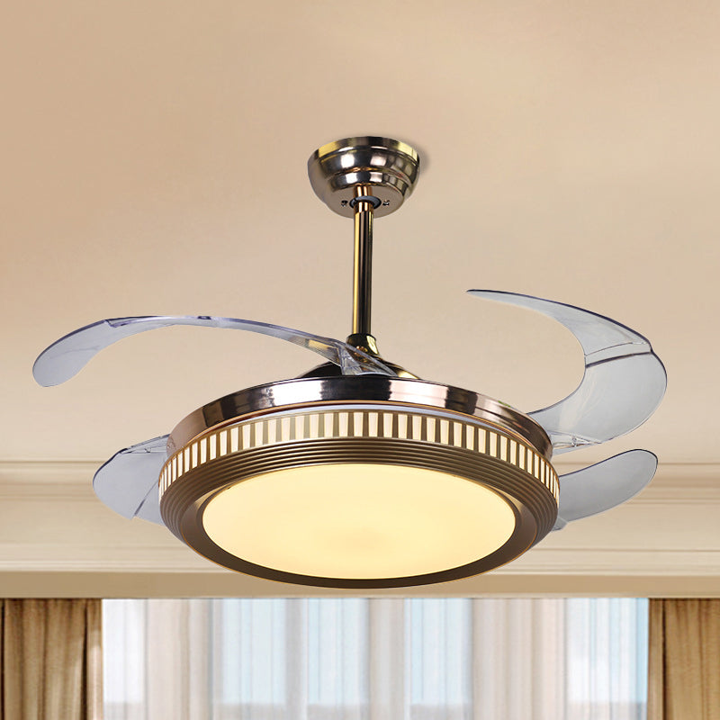 Ventilateur de plafond circulaire à LED moderniste métallique argenté, montage semi-encastré avec 4 pales transparentes, largeur de 16,5 po