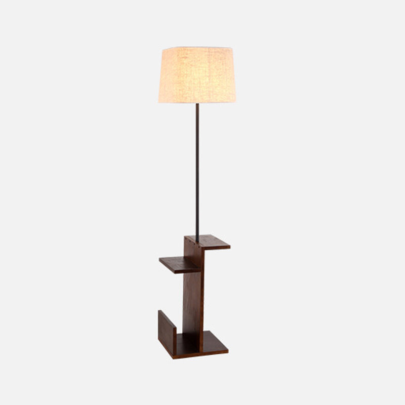 Lampadaire LED contemporain en forme de tambour, luminaire sur pied pour salon en tissu avec étagère en bois