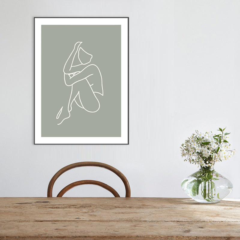 Toile de dessin au trait minimaliste pour femme, impression d'art mural texturée vert-blanc pour chambre