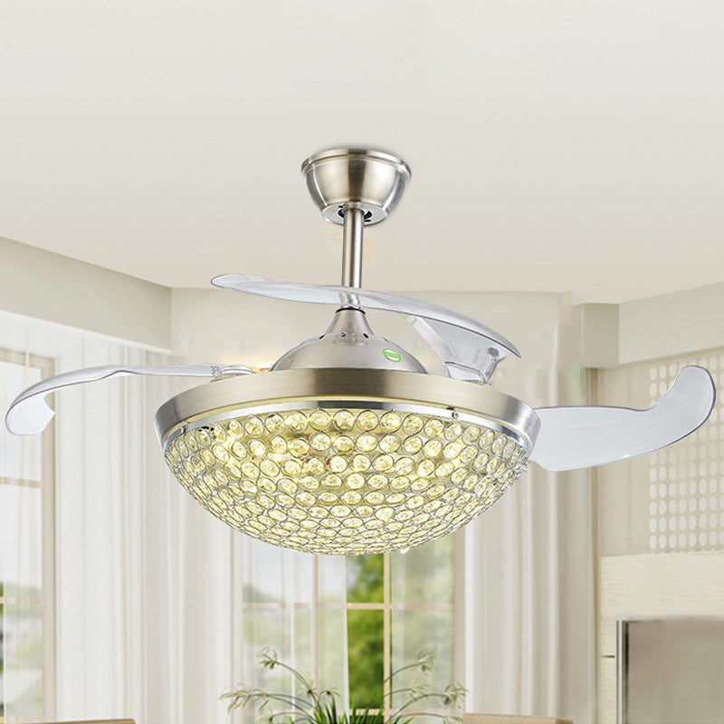 Modernism 19" Wide LED Semi Flush Ceiling Light Silver Bowl 4 Blades Pendant Fan Lamp Fixture with Crystal Embedded Shade Clearhalo 'Ceiling Fans with Lights' 'Ceiling Fans' 'Modern Ceiling Fans' 'Modern' Lighting' 1983314