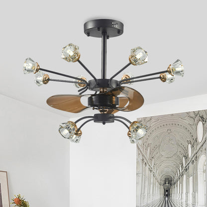 Traditional Swirled Arms Semi-Flush Mount 12 Heads Crystal Floral Shade 3 Blades Hanging Fan Lamp in Black, 30" Wide Clearhalo 'Ceiling Fans with Lights' 'Ceiling Fans' Lighting' 1409162