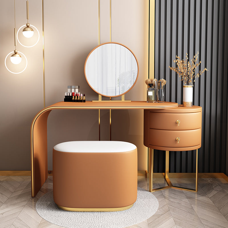 Tavolo da toeletta da trucco in pelle autentica con specchio e set di sgabelli