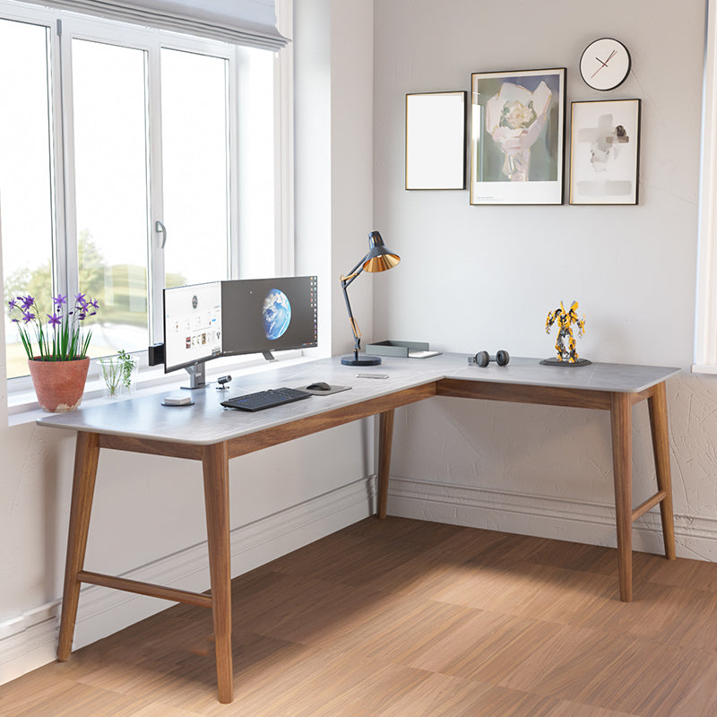 Destina moderna della metà del secolo Pine in legno a forma di angolo a forma di pietra con top in pietra