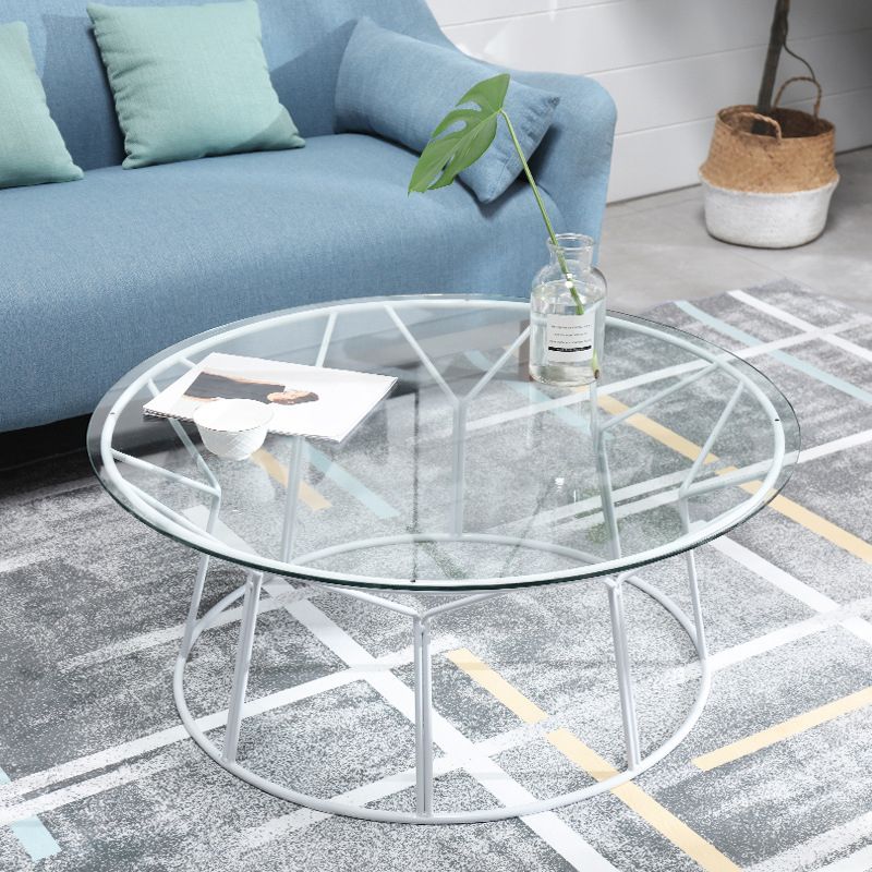 Tavolino contemporaneo con top in vetro rotondo e base di ferro