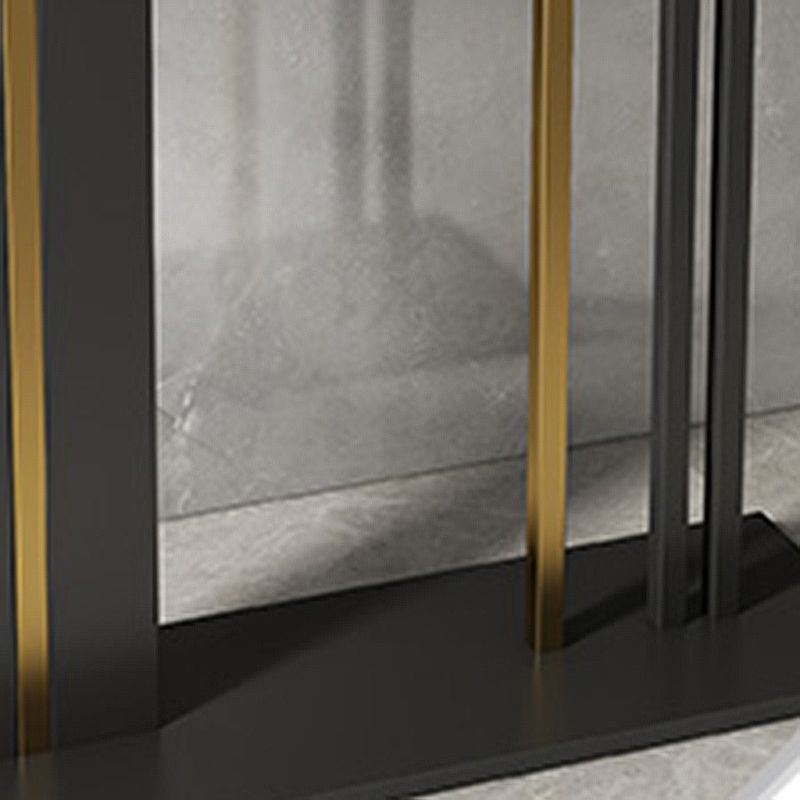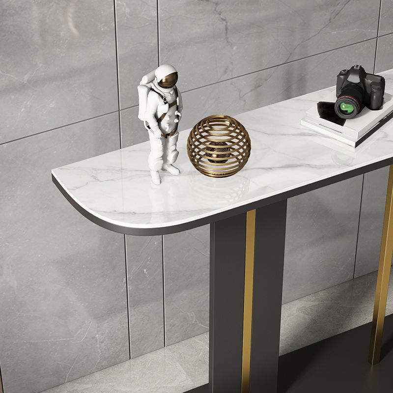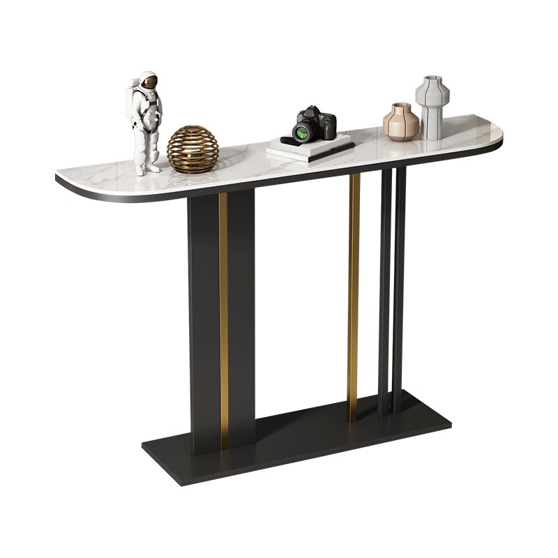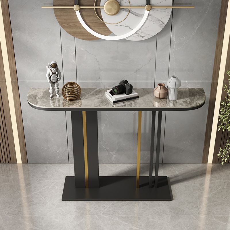 Tavolino moderno con console a mezza luna con top in pietra e base di piedistallo di ferro