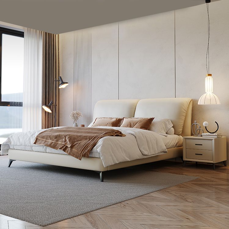 金属製の脚のある現代の本物の革のベッドフレームベージュ標準ベッド