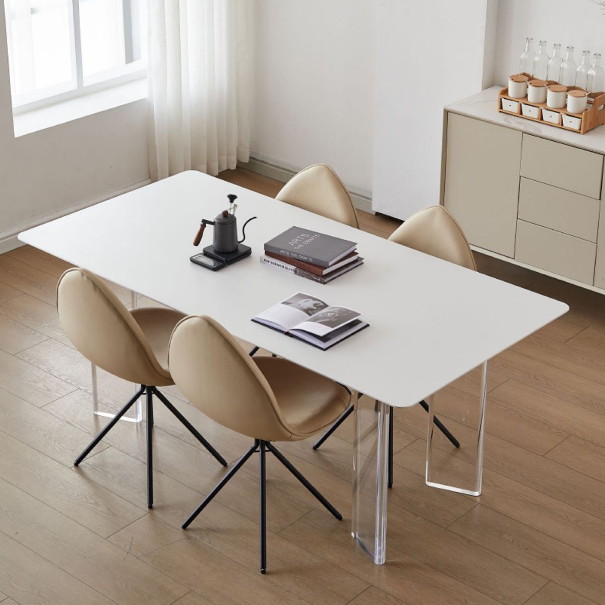 製品コレクション:ホワイト47 "L x 31" wホワイト51.2 "L x 31.5" wホワイト55.1 "l x 31.5" wホワイト63 "l x 31.5" wホワイト70.9 "l x 35.4" w 4ベージェ椅子5ピース:表4椅子