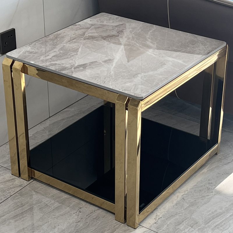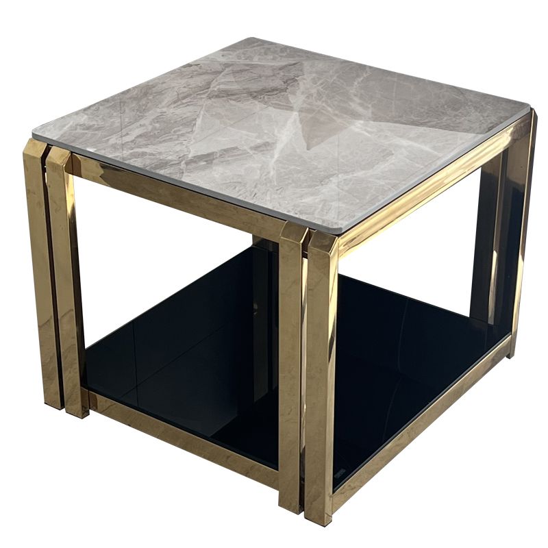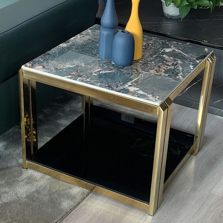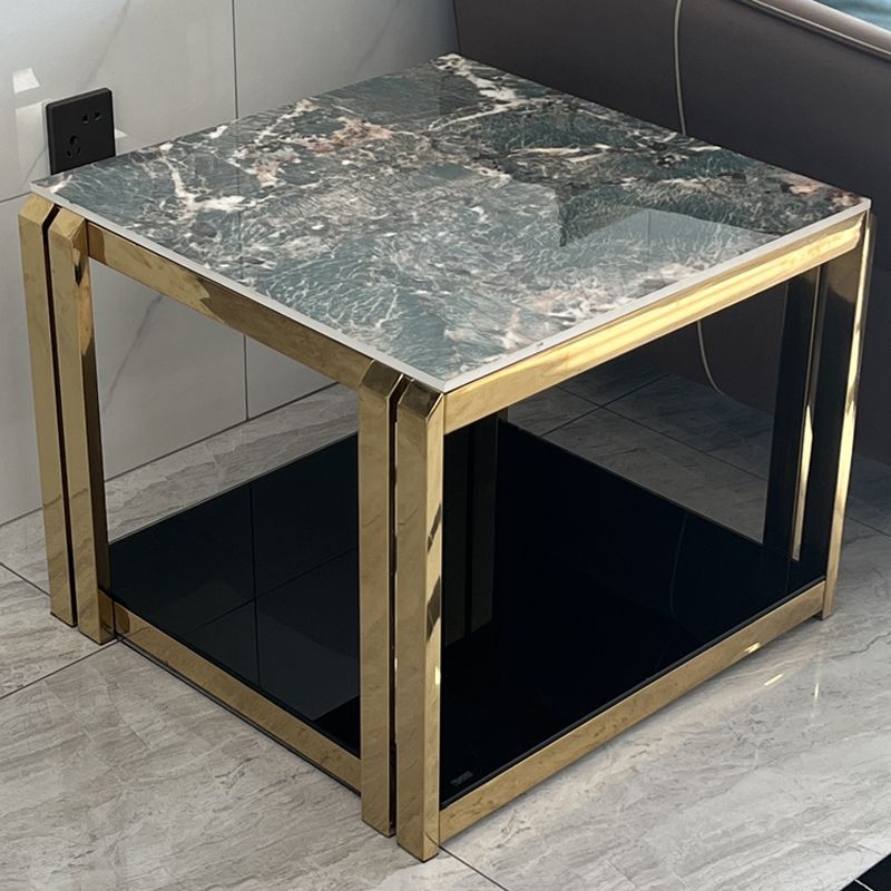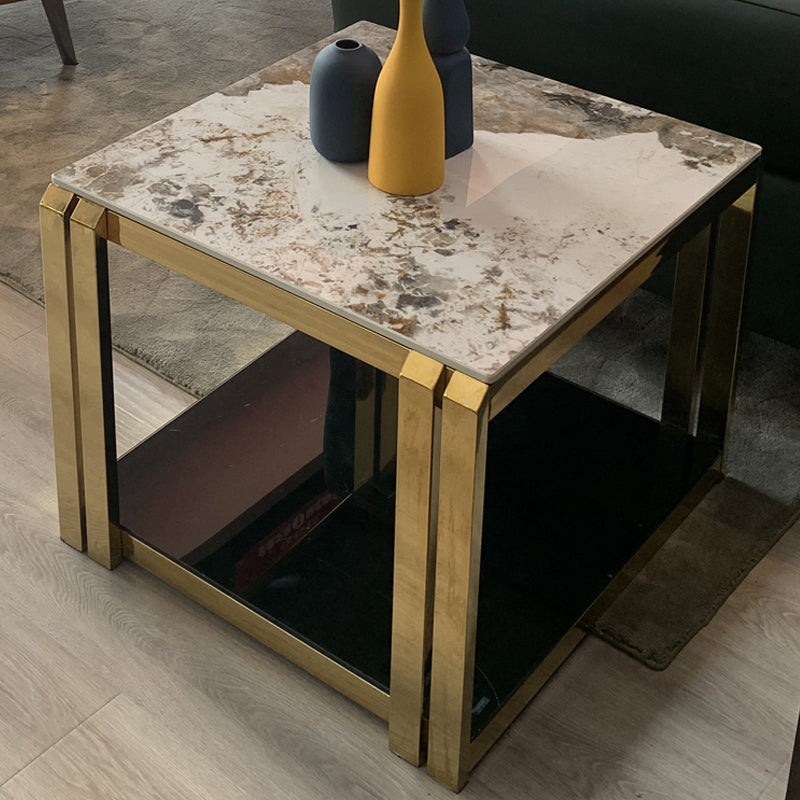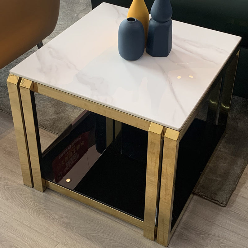 棚付きの石の上端テーブルグラムフレームソファのサイドテーブルリビングルーム