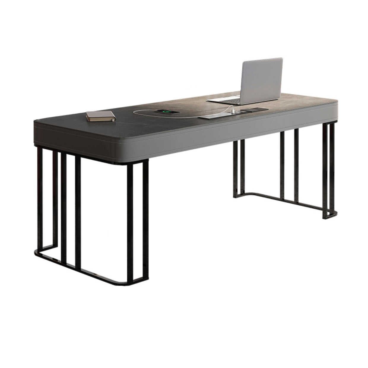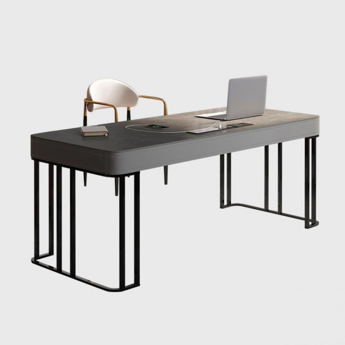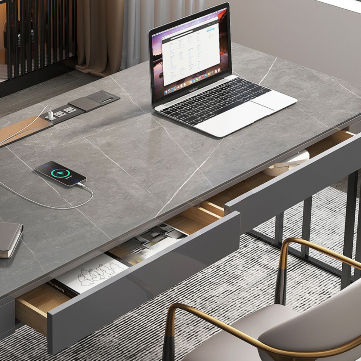 Donkere taupe en zwarte bureausteensteen en roestvrijstalen schrijfbureau met 2 laden