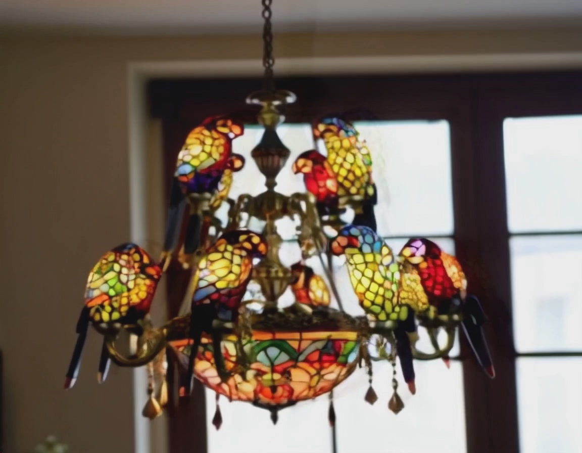 12 armen papegaai suspensie licht rustiek gebrandschilderd glas kroonluchter licht met middelste kom in geel