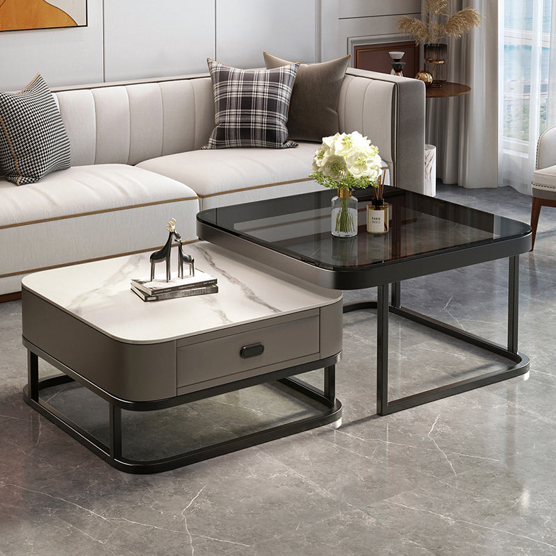 Moderne salontafel met glazen blad en vierkante nestbare salontafelset