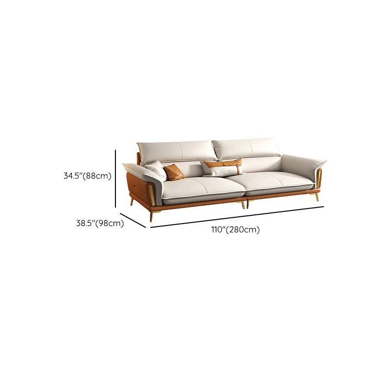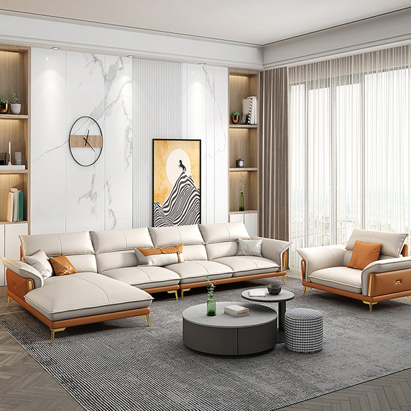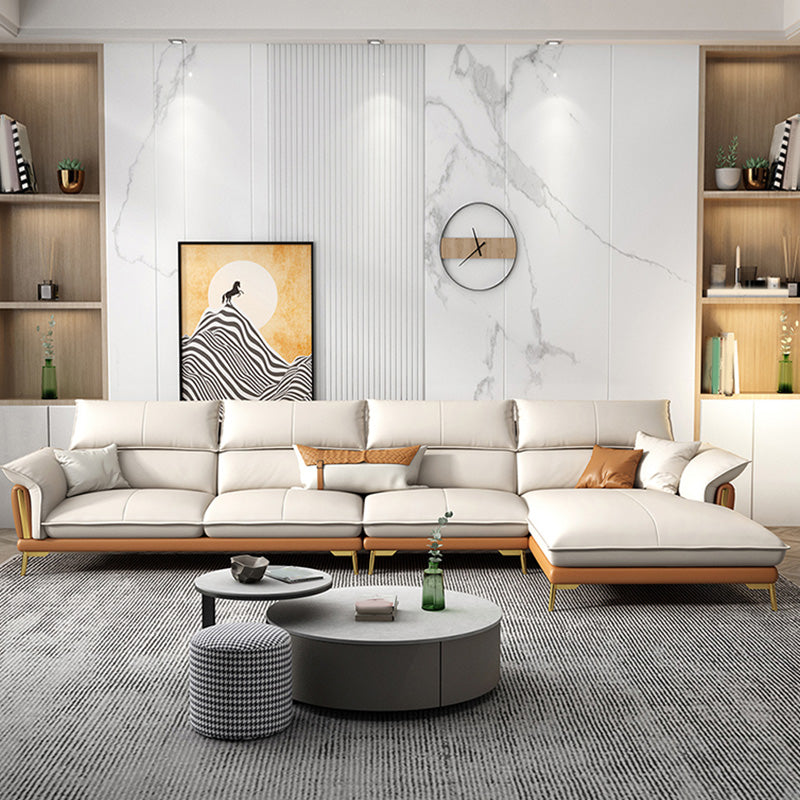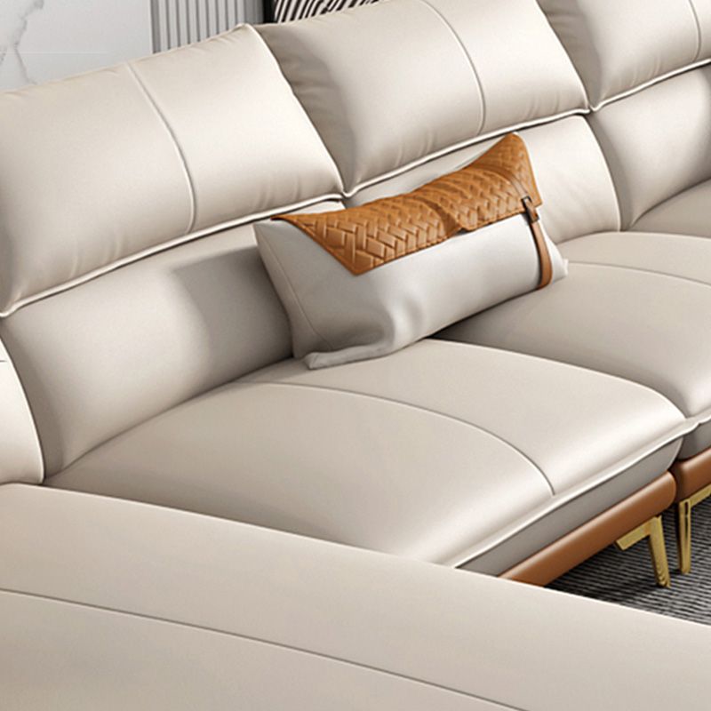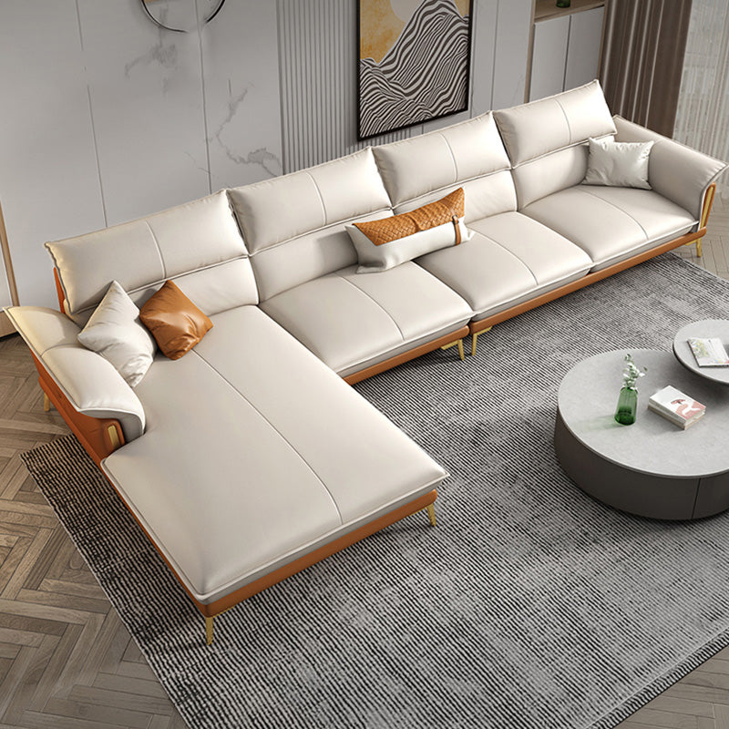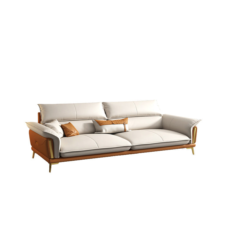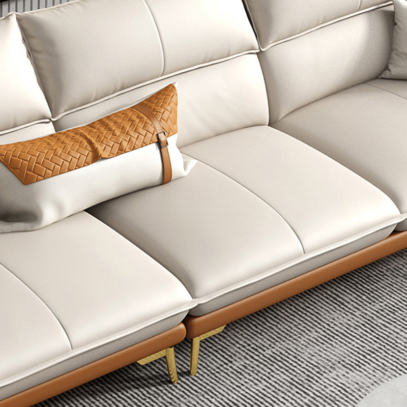 Glam lederen woonkamer zitplaatsen wijd uitlopende armkussens witte bank
