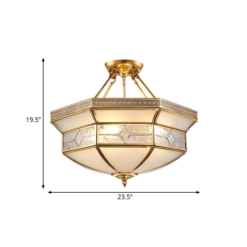14"/18"/23.5" Wide 3/4/6 Lights Frosted Glass Ceiling Mounted Fixture Vintage Brass Geometric Living Room Semi Mount Lighting Clearhalo 'Ceiling Lights' 'Chandeliers' 'Close To Ceiling Lights' 'Close to ceiling' 'Glass shade' 'Glass' 'Semi-flushmount' Lighting' 276861