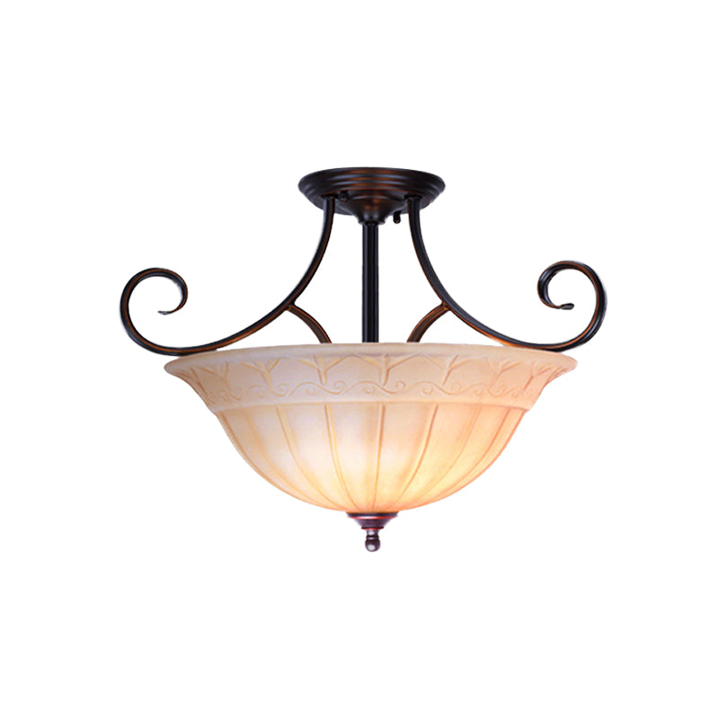 Bowl Dining Room Semi Flush Traditional Frosted Glass 3 Heads Black Flush Mount with Scrolled Arm Clearhalo 'Ceiling Lights' 'Close To Ceiling Lights' 'Close to ceiling' 'Glass shade' 'Glass' 'Semi-flushmount' Lighting' 808529