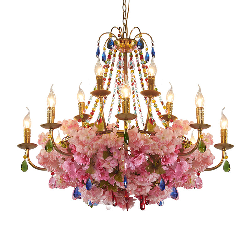 Candlestick Restaurant Hanging Chandelier Antique Iron 6/12 Lights Gold Flower Pendant with Colorful Crystal Clearhalo 'Cast Iron' 'Ceiling Lights' 'Chandeliers' 'Industrial Chandeliers' 'Industrial' 'Metal' 'Middle Century Chandeliers' 'Rustic Chandeliers' 'Tiffany' Lighting' 738596