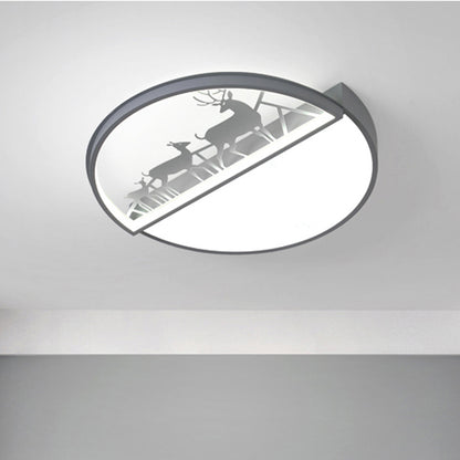 Circle Flush Mount Recessed Lighting Nordic Acrylic Bedroom LED Ceiling Lamp with Deer Silhouette in Grey/Black/White