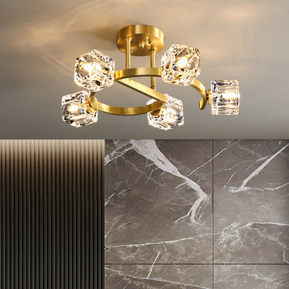 Cubic Clear Crystal Shade Ceiling Fixture Contemporary 5/7 Heads Bedchamber Semi Flush Light in Gold Clearhalo 'Ceiling Lights' 'Close To Ceiling Lights' 'Close to ceiling' 'Semi-flushmount' Lighting' 1400148