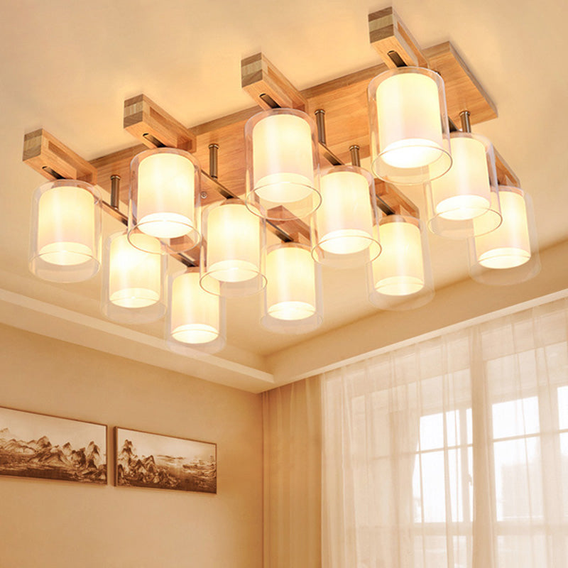 Cylindrical Living Room Semi Flush Light Double-Layer Glass Simplicity Flush Mount Ceiling Chandelier in Wood
