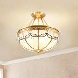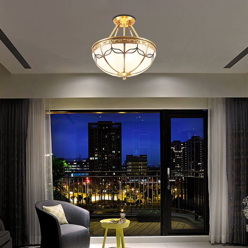 Domed Opal Glass Semi Mount Lighting Vintage 4-Light Bedroom Semi Flush in Brass, 12.5"/16" Wide Brass Clearhalo 'Ceiling Lights' 'Close To Ceiling Lights' 'Close to ceiling' 'Glass shade' 'Glass' 'Semi-flushmount' Lighting' 276692