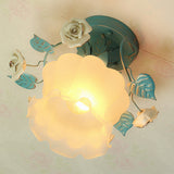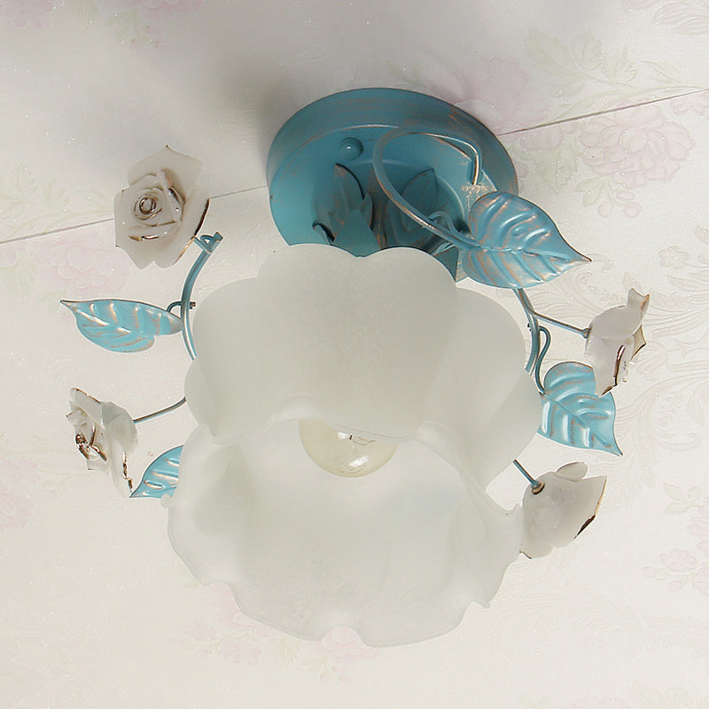 Floral Shape Living Room Flush Mount Pastoral Frosted White Glass 1-Light Blue Ceiling Flush Mount Light