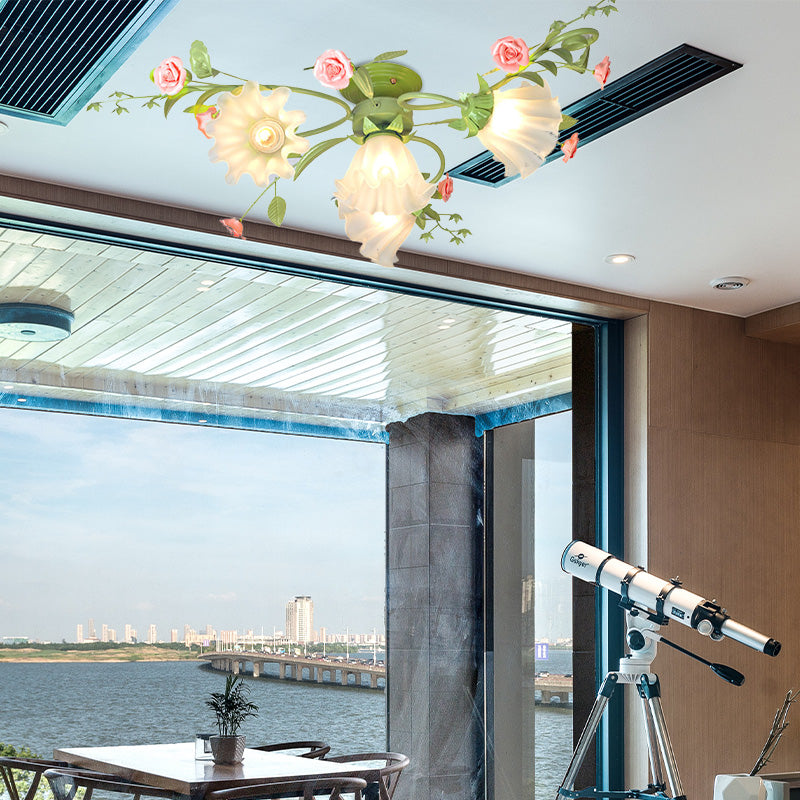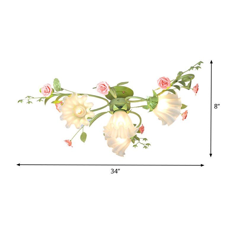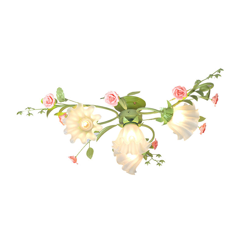 Metal White/Green Ceiling Fixture Scalloped 4 Bulbs Pastoral Flower Semi Flush Light for Bedroom