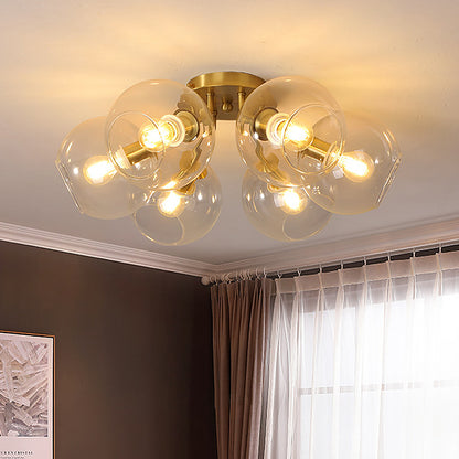 Vintage Bubble Clear Glass Ceiling Light 6 Heads Semi Flush Mount Chandelier in Brass for Parlor