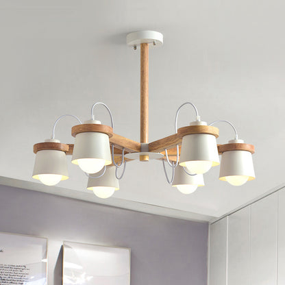 Wheel Style Wood Semi Flush Nordic 6 Bulbs White Ceiling Mount Chandelier with Barrel Lampshade