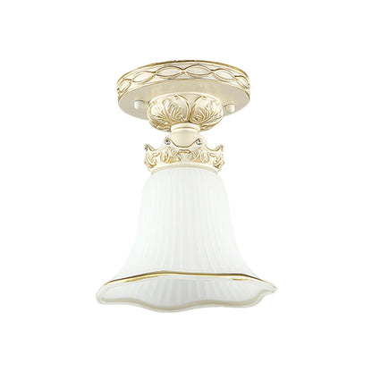 White 1 Head Flush Mount Light Vintage Milky Glass Ridged Flower Ceiling Fixture with Crown Design