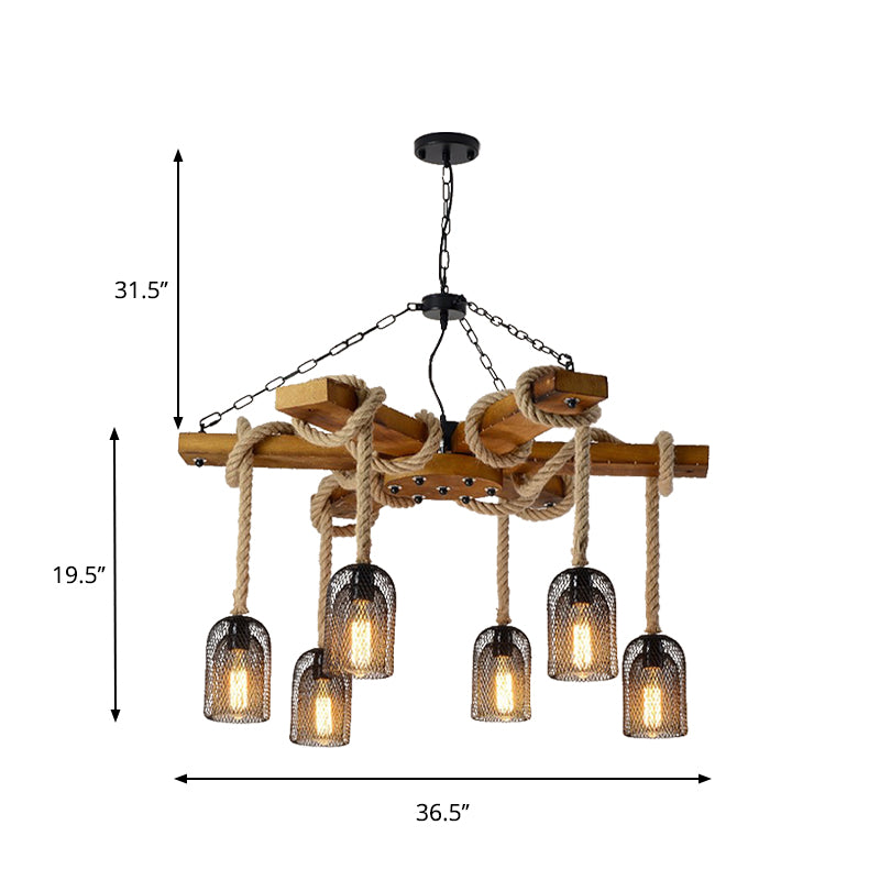 Wire Mesh Restaurant Ceiling Fixture Wood and Rope 3/6 Lights Lodge Stylish Pendant Lighting with Base in Brown